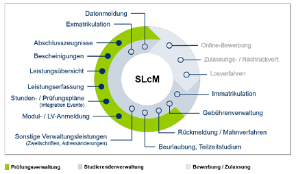 - Studierendenverwaltung, mit der technischen Unterstützung für Prozesse aus den Gebieten Studienbewerbung, Zulassung, Immatrikulation über die Studienorganisation bis hin zur Exmatrikulation.