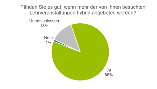 Insgesamt hat uns die positive Resonanz von Studierenden, Lehrenden und Assistierenden besonders gefreut. Gefragt, ob sie sich mehr Lehrveranstaltung im hybriden Format wünschen, haben 86% der teilnehmenden Studierenden positiv geantwortet.