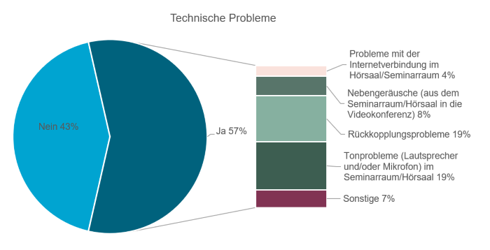In hybriden Szenarien ist die Gewährleistung eines reibungslosen technischen Aufbaus eine besondere Herausforderung für Lehrende und Assistierende. Unsere Umfragen haben ergeben, dass 57% der Studierenden technische Probleme als störend empfunden haben. Die meisten Schwierigkeiten treten im Zusammenhang mit Akustik und Tonübertragung auf.