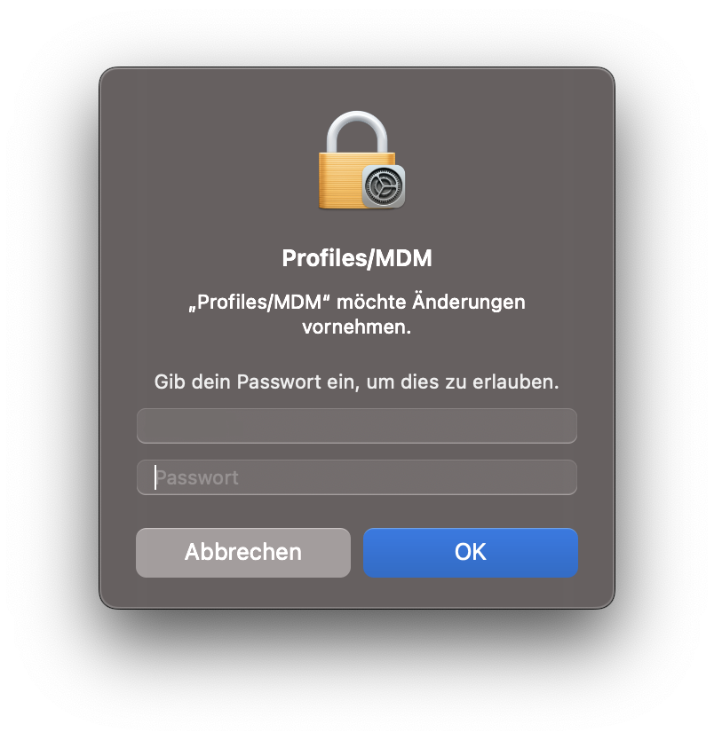 Bestätigen Sie die Installation mit Ihrem lokalen (eigenen) macOS Admin-Account. Danach auf OK.