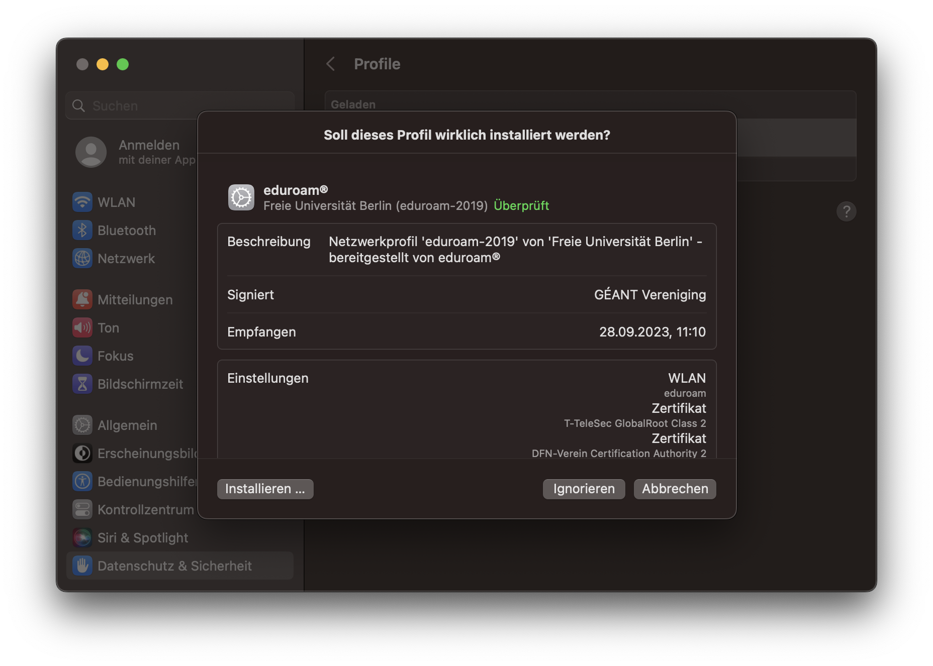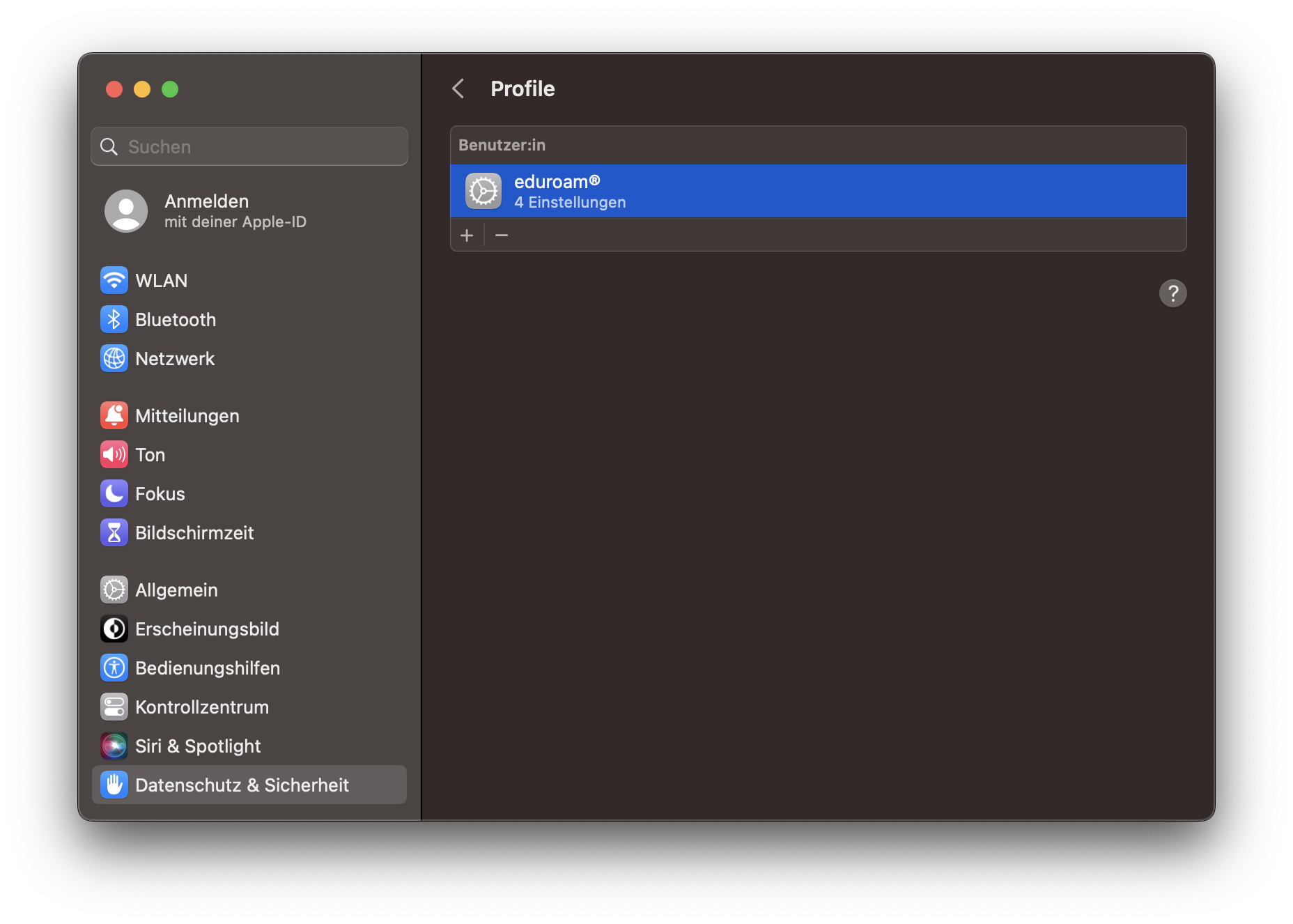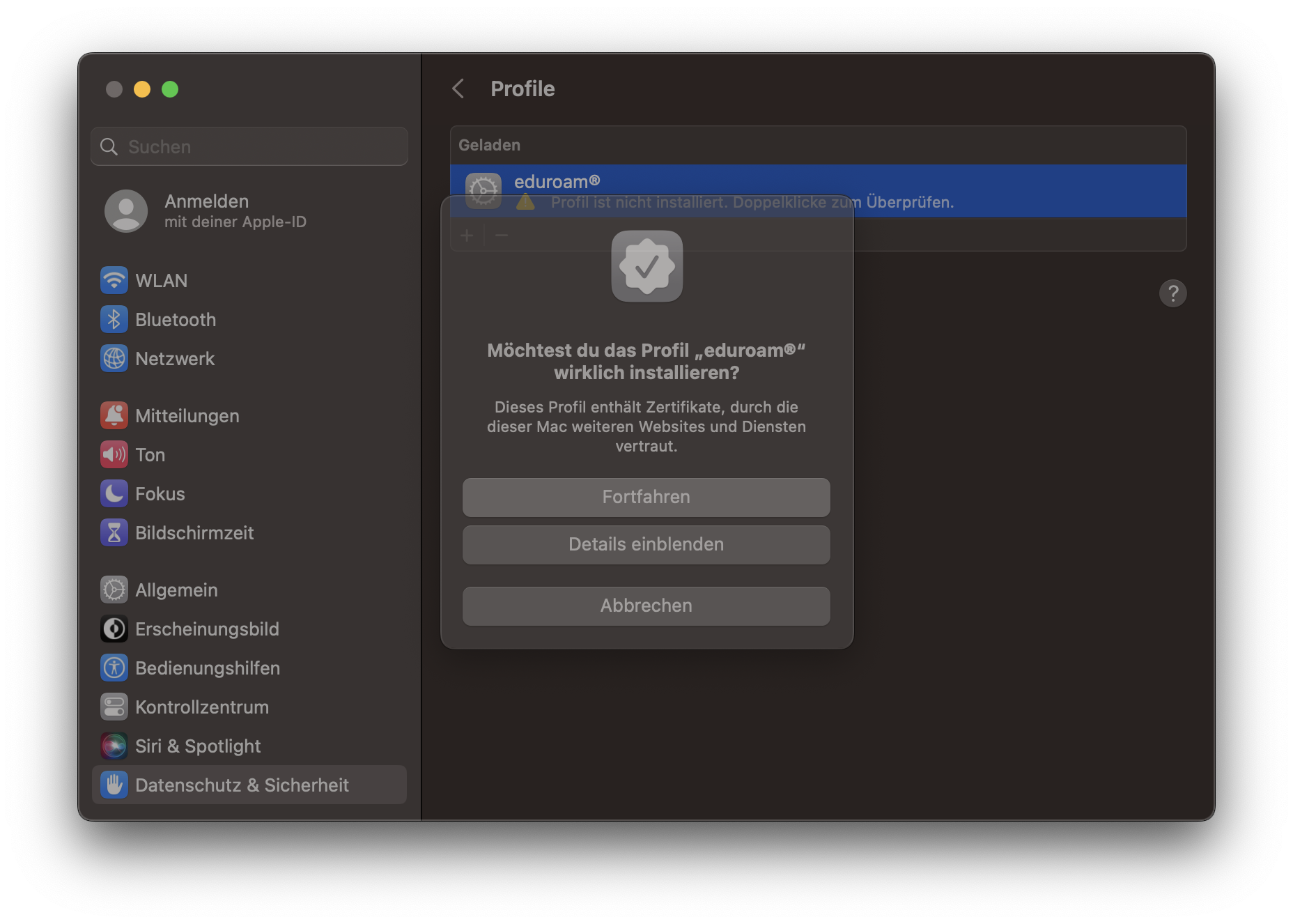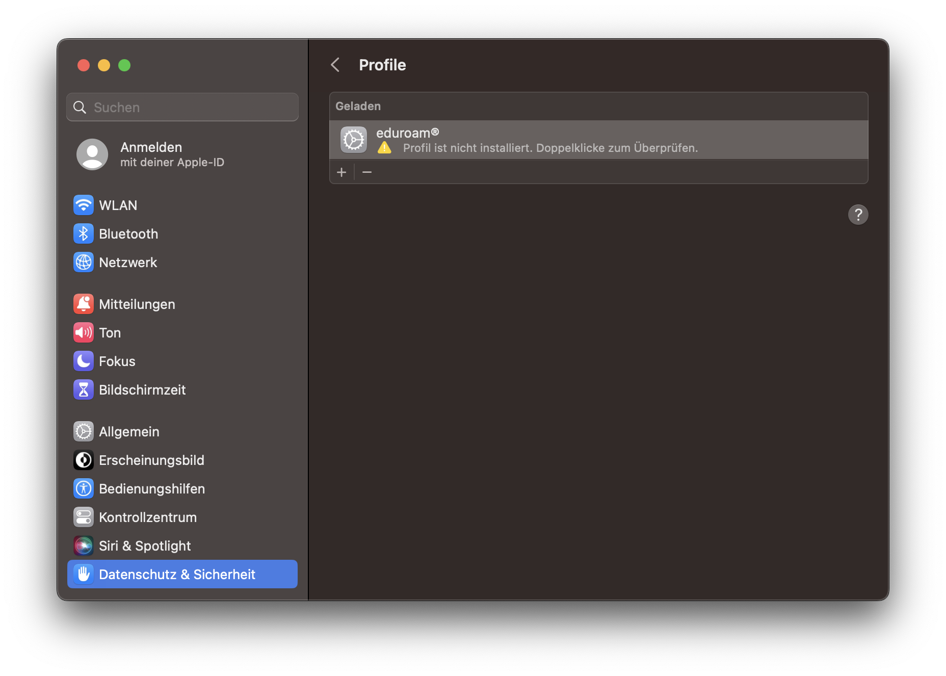 Hinweis: Bitte beachten Sie, dass unter macOS eine ggf. vorhandene eduroam-Konfiguration zuerst gelöscht werden muss! Bei Problemen bzw. bereits vorhandener eduroam-Konfiguration folgen Sie bitte den Anweisungen [#hier].