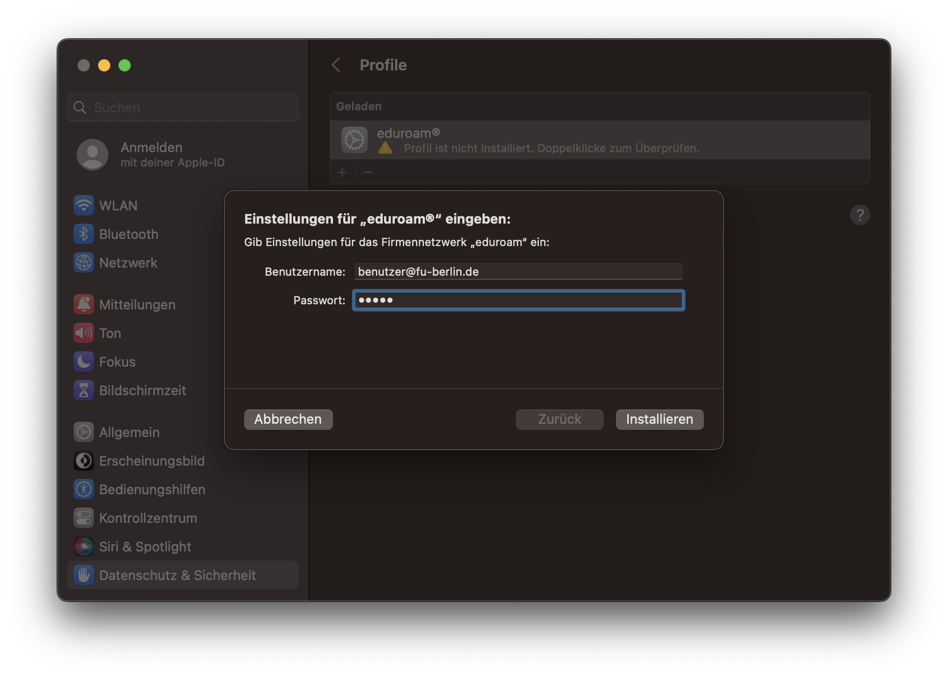 Hinweis: Es handelt sich bei "benutzer@fu-berlin.de" nicht um eine E-Mail-Adresse, sondern um eine Zuordnung Ihrer Identität ("benutzer") sowie Ihrer Zugehörigkeit zur FU Berlin in dem zu installierenden Profil, bitte geben Sie daher hier nicht Ihre übliche FU-Mailadresse der Form Vorname.Nachname@fu-berlin.de ein.