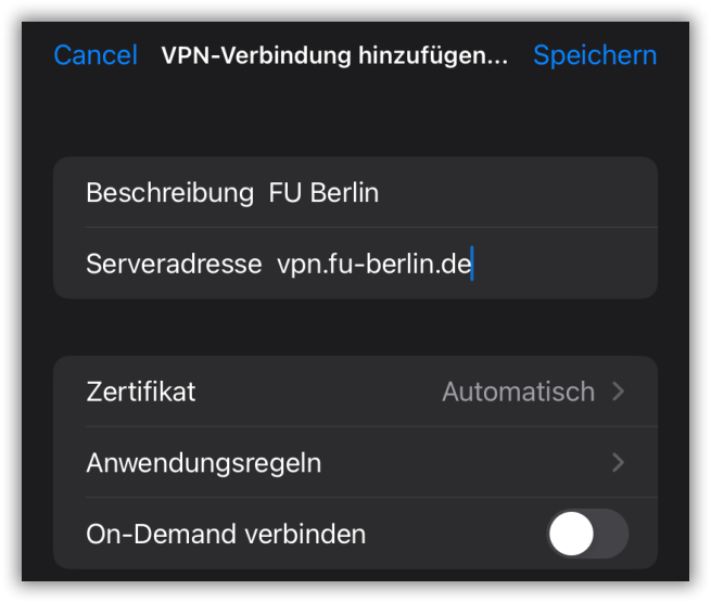 Geben Sie nun bitte bei Beschreibung FU Berlin und bei Serveradresse vpn.fu-berlin.de